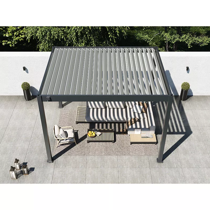 Vionta's pergola met lamellen voor buiten is uitgerust met een efficiënt, verstelbaar lamellenontwerp, waardoor gebruikers de hoek van de lamellen eenvoudig kunnen aanpassen aan de weersomstandigheden en dagelijkse behoeften.