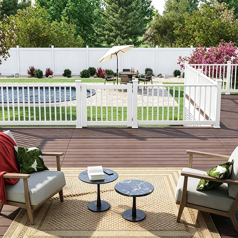Het standaard Vionta Vinyl Guardrail-systeem is getest om een geconcentreerde zijdelingse belasting van 200 pond te weerstaan (ongeveer 90 kg), terwijl het versterkte type (met stalen kernpalen) zijdelingse belastingen van meer dan 300 kg kan verdragen pond. Het productontwerp voldoet aan de ASTM D4477-normen en de International Residential Code (IRC R312 sectie), waarbij de afstand van de vangrails binnen een afstand van 3-5/8 inch wordt gehouden om klimmen of passeren effectief te voorkomen kinderen. Wij kunnen structurele berekeningsdocumenten (engineering letters) leveren die zijn afgestemd op de lokale regelgeving in de regio van de klant om te helpen bij bouwvergunningsaanvragen.
